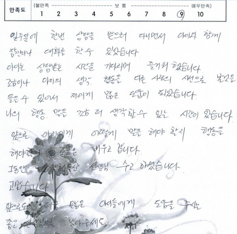 일주일에 한번 상담을 받으러 다니면서 아이와 함께 잠깐이나마 대화를 할 수 있었습니다.